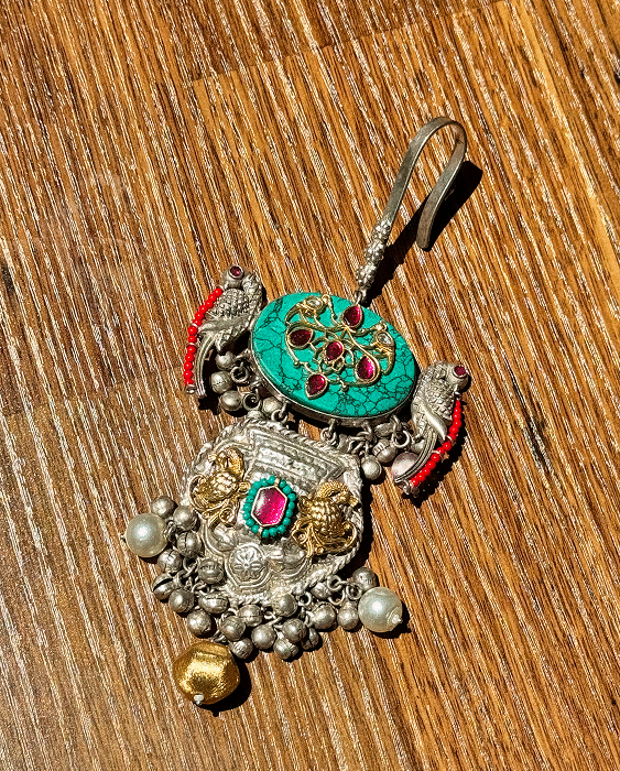 Bold meets boho in the Kavya Necklace, a striking imitation jewelry piece crafted from black metal with elegant teal accents. At its heart hangs a beautifully detailed bird brooch, adding a whimsical and artistic flair. Perfect for contemporary ethnic styles or adding an eclectic twist to fusion outfits.