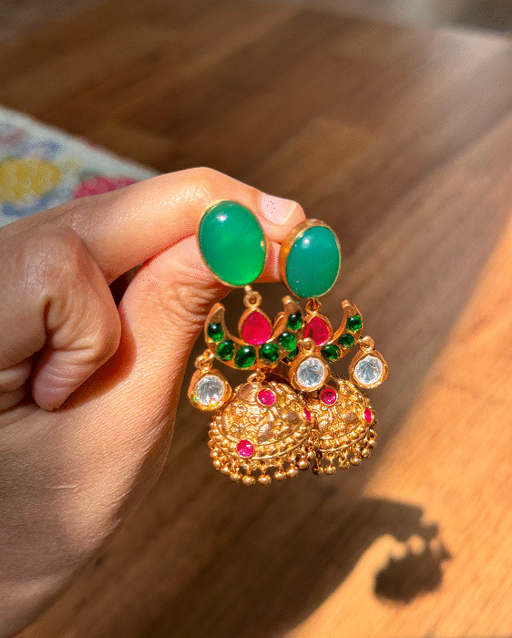 Classic and captivating, the Sitara Jhumkas feature a timeless gold-tone finish adorned with vibrant green stones for a regal touch. Crafted in imitation jewelry style, these jhumkas blend tradition with elegance — perfect for weddings, festive celebrations, or adding heritage charm to any outfit.