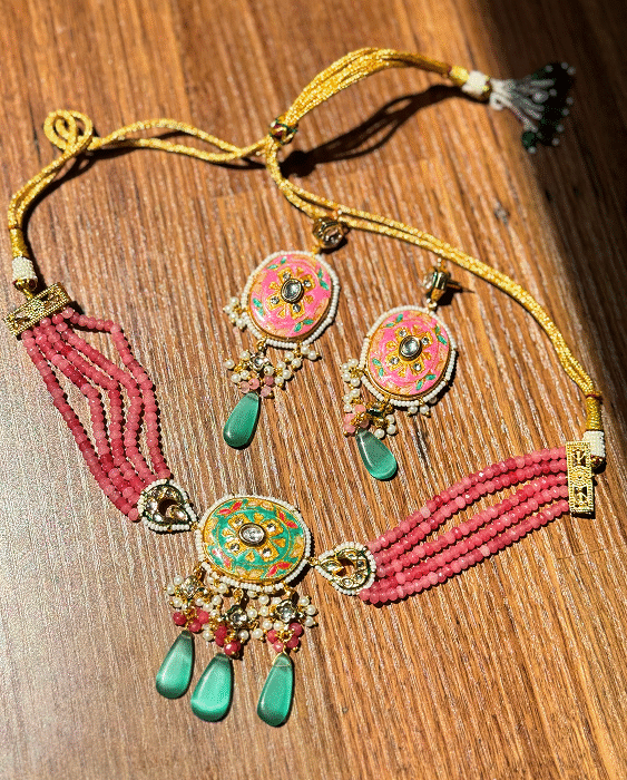 Soft, graceful, and effortlessly chic — the Aira Choker Set features delicate pastel tones highlighted by sea green/teal stones, exuding a fresh and modern charm. Crafted in imitation jewelry on a brass base, this set is perfect for daytime celebrations, bridesmaids, or anyone who loves subtle sophistication with a splash of color.