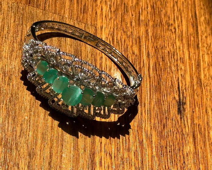 Elegant and eye-catching, the Nayra Bangle features dazzling diamond-look stones accented with colour stones, crafted on a lustrous imitation jewelry base. Perfect for adding a touch of sparkle to festive outfits or stacking with other favorites for a personalized statement.